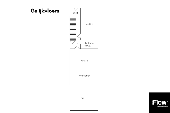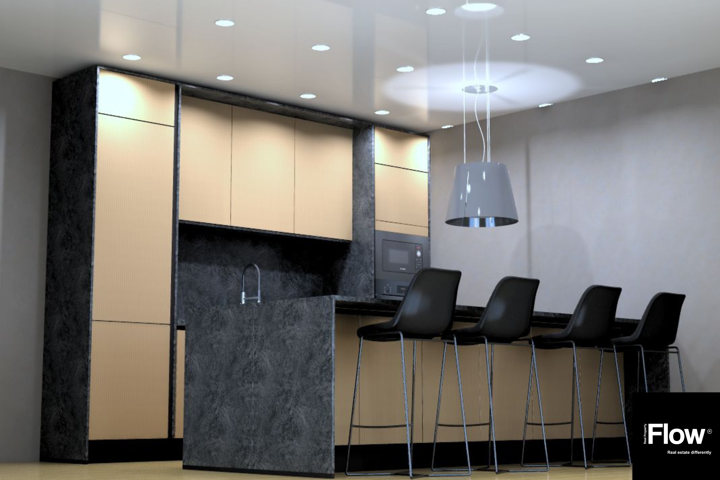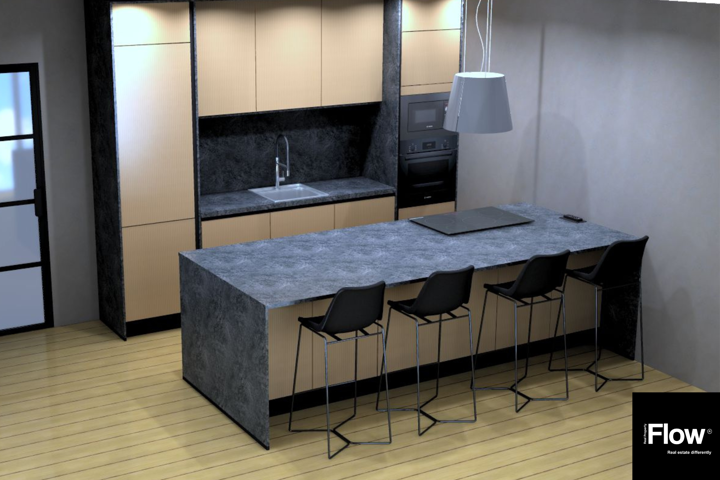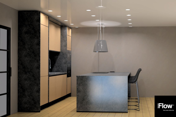 Ground floor : hall d’entrée, salle de douche, séjour lumineux avec cuisine ouverte (± 38 m²), terrace (± 23 m²) et garage.