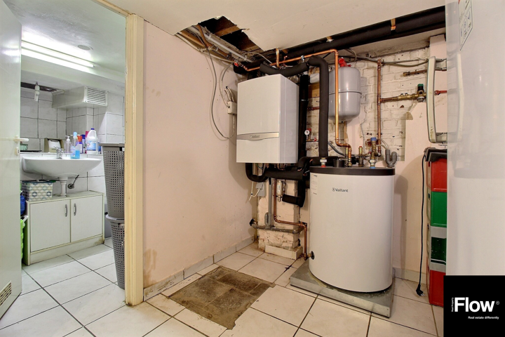 Au sous-sol : chaufferie avec chaudière Vaillant gaz condensation (2022) + boiler.