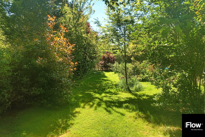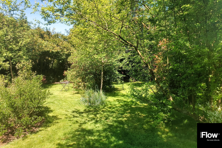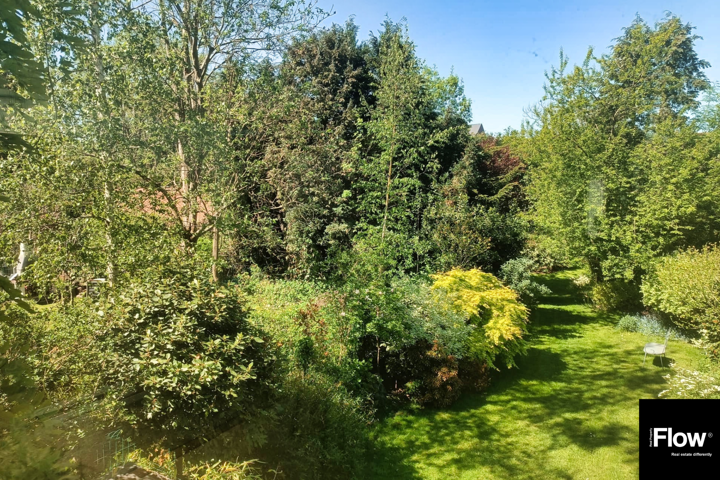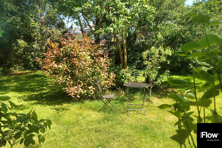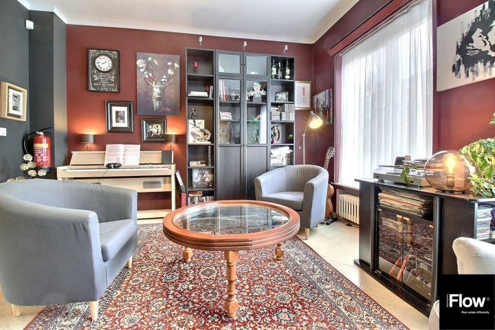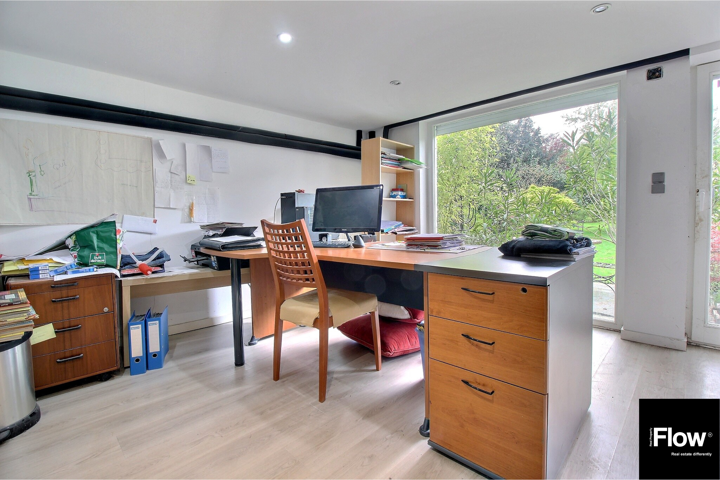 Au 1er étage (+/- 60), un hall mène à un séjour lumineux avec vue sur un oasis de verdure et accès direct au jardin, une salle à manger, une cuisine équipée, un bureau de 18 m² (profession libérale possible) et un WC séparé.